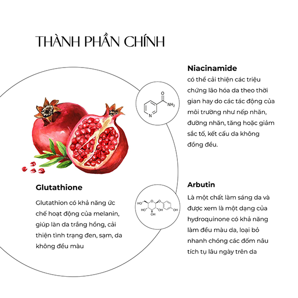 + Niacinamide: có thể cải thiện các triệu chứng lão hóa da theo thời gian hay do các tác động của môi trường như nếp nhăn, đường nhăn, tăng hoặc giảm sắc tố, kết cấu da không đồng đều.